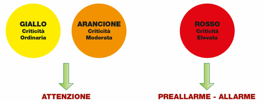 L’allertamento regionale, in linea con quanto previsto a livello nazionale, si basa sui codici colore, con quattro diversi livelli di criticità crescente a seconda della previsione dell’estensione del fenomeno e del suo impatto sull’ambiente, sulle attività antropiche, sui centri abitati e sulla salvaguardia della popolazione.