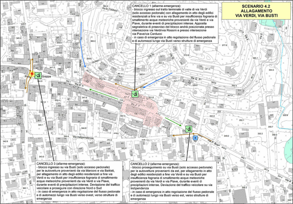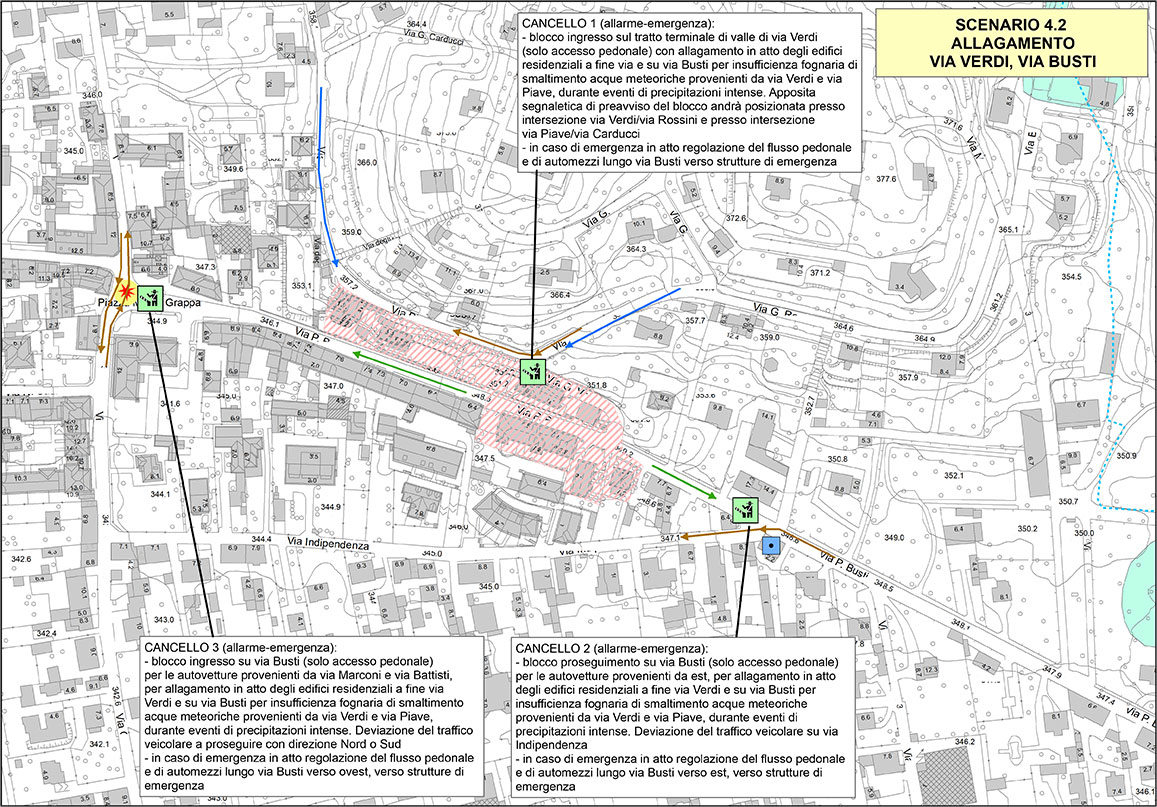 Nell’area compresa tra via Verdi e via Busti dove le acque provenienti dalle porzioni più rilevate (via Rossini, via Via Piave) tendono ad incanalarsi lungo la viabilità stradale acquistando progressiva velocità e forza senza essere adeguatamente incanalate si sono verificati spesso fenomeni di allagamento a seguito di eventi meteorici molto intensi causati da insufficienze e/o sovraccarico della rete di smaltimento acque chiare.