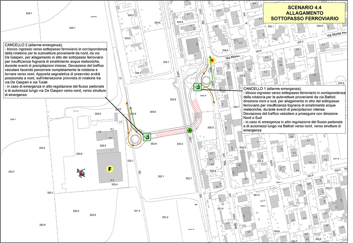Si segnalano nel territorio comunale la presenza di un sottopasso ferroviario di recente realizzazione che collega la S.P.2 a via de Gasperi soggetti al potenziale allagamento per insufficienza idraulica delle opere di raccolta e smaltimento o per il mancato funzionamento degli impianti di svuotamento (pompe). Il rischio è particolarmente significativo nel caso di arresto di autoveicoli nella porzione più depressa del sottopasso.